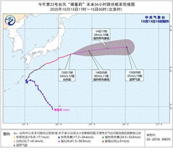 预计,“娜基莉”将以每小时40-45公里的速度向东偏北方向快速移动,强度逐渐减弱,15日将变性为温带气旋。未来“娜基莉”对我国无影响。